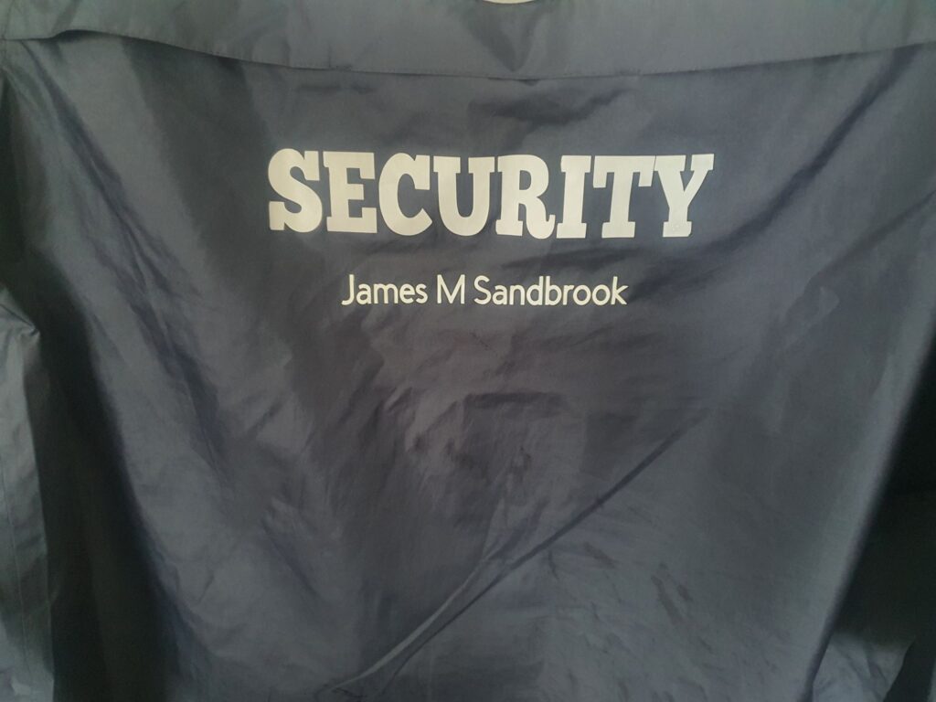 This is one of my raincoats for work. I added the James M Sandbrook because I had a favourite fisherman’s raincoat, that had only the word Security on it and someone took it. So I decided to put my name on this one hoping that people won’t want to use it because my name is on it.