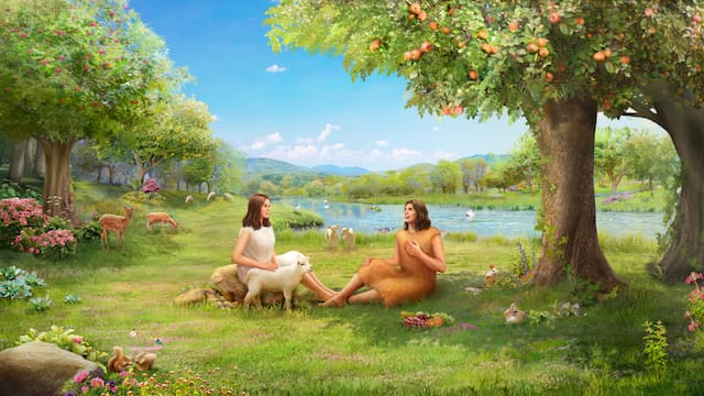 Pictures show the Garden of Eden as nature in its greenest state, growing, unkept, natural, and the two humans Adam and Eve living a wonderful life in this environment. Peace and harmony ensued and love was the cause.