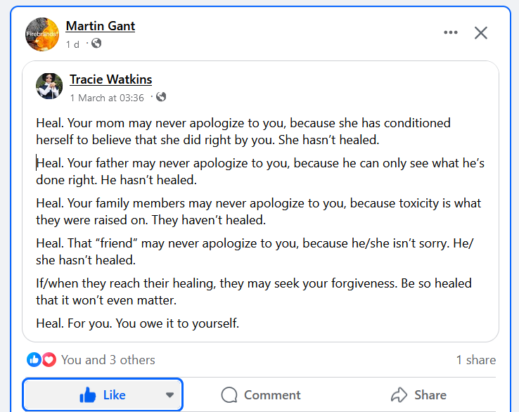 “Thank you so much for making right the wrongs that were done to me, and for apologizing, making the efforts that you hand made, admitting your mistake publicly clears my name, and shows me that I am worth something to you. This makes me feel that I can now finally trust you, have faith in you, and each to know you better. “