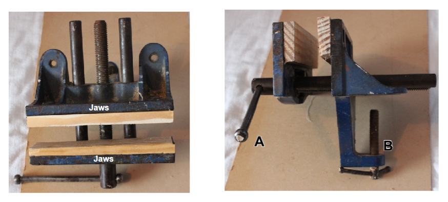 There are many small useful vices on the market to help you work on projects. At point “A” we have the clamp that is used to secure the vice to a workbench, table, or even a piece of wood. I have bolted one of my vices onto a piece of wood and then use a big clamp to clamp it to the work bench – this set up allows me to move that vice to where I need it.
