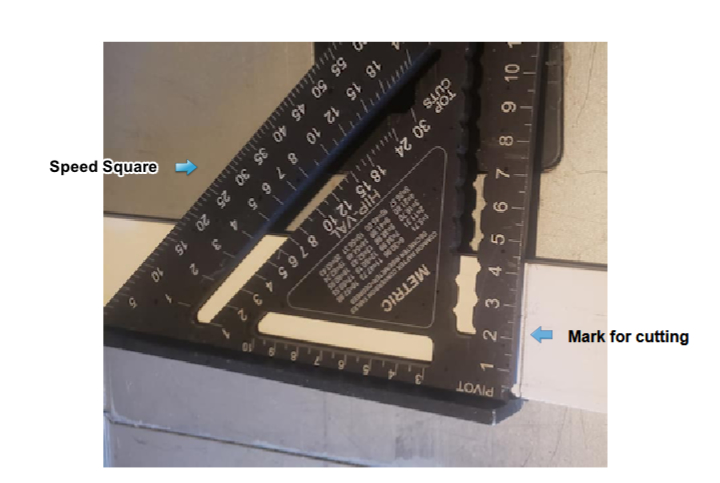 Then they watched their Father put the ruler next to the wood and say, “What we want is to choose a length that makes the job easy, or if we were to put the project in a certain place in the garage or house the measurements would have to fit what it is built for. Lets go for 200 mm (roughly 8 inches). After measuring the length he wanted, Father got the Speed Square and marked the place where the wood would need cutting. (See Image 2)