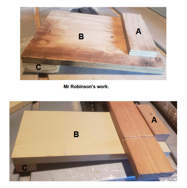 “Lets measure the width of B, not the length, and then make A shorter to a size suitable for you and your Bench Hook, so as to leave a gap that we can use to steady the saw for when we use it.” Mr Robinson said, he continued, “And C goes the total length of the width of B. C is what hooks on the work bench.”