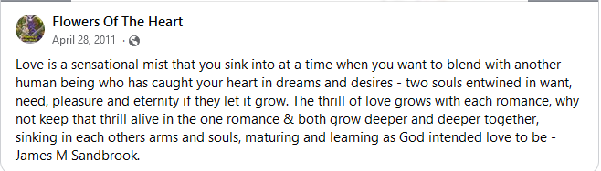 Love is a sensational mist that you sink into at a time when you want to blend with another human being who has caught your heart in dreams and desires – two souls entwined in want, need, pleasure and eternity if they let it grow. The thrill of love grows with each romance, why not keep that thrill alive in the one romance & both grow deeper and deeper together, sinking in each others arms and souls, maturing and learning as God intended love to be – James M Sandbrook.