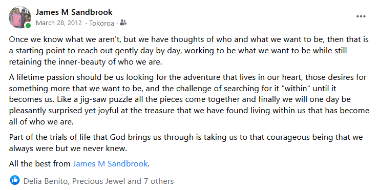 A lifetime passion should be us looking for the adventure that lives in our heart, those desires for something more that we want to be, and the challenge of searching for it “within” until it becomes us. Like a jig-saw puzzle all the pieces come together and finally we will one day be pleasantly surprised yet joyful at the treasure that we have found living within us that has become all of who we are.