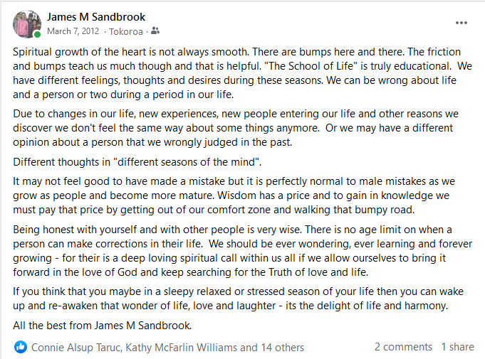 Being honest with yourself and with other people is very wise. There is no age limit on when a person can make corrections in their life. We should be ever wondering, ever learning and forever growing – for their is a deep loving spiritual call within us all if we allow ourselves to bring it forward in the love of God and keep searching for the Truth of love and life.