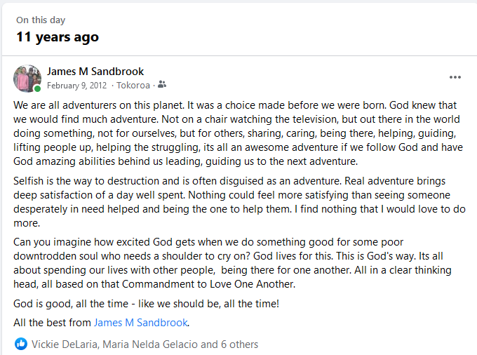 Can you imagine how excited God gets when we do something good for some poor downtrodden soul who needs a shoulder to cry on? God lives for this. This is God’s way. Its all about spending our lives with other people, being there for one another. All in a clear thinking head, all based on that Commandment to Love One Another.