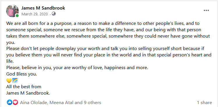 We are all born for a a purpose, a reason to make a difference to other people’s lives, and to someone special, someone we rescue from the life they have, and our being with that person takes them somewhere else, somewhere special, somewhere they could never have gone without you.