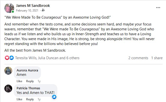 And remember when the tests come, and some decisions seem hard, and maybe your focus wavers, remember that “We Were made To Be Courageous” by an Awesome Loving God who leads us if we listen and who builds us up in Inner-Strength and teaches us to have a Loving Character. You were made in His image, He is strong, be strong alongside Him! You will never regret standing with the billions who believed before you!