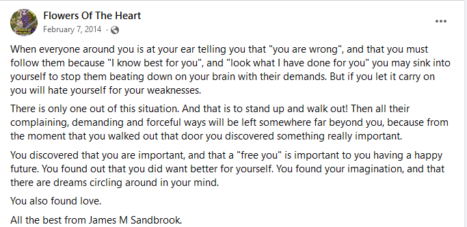 When everyone around you is at your ear telling you that “you are wrong”, and that you must follow them because “I know best for you”, and “look what I have done for you” you may sink into yourself to stop them beating down on your brain with their demands. But if you let it carry on you will hate yourself for your weaknesses.