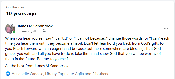 When you hear yourself say “I can’t…!” or “I cannot because…” change those words for “I can” each time you hear them until they become a habit. Don’t let fear hold you back from God’s gifts to you. Reach forward with an eager hand because out there somewhere are blessings that God graces you with and all you have to do is take them and show God that you will be worthy of them in the future. Be true to yourself.